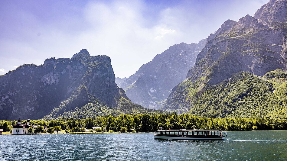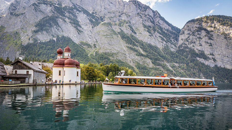 Der Königssee im Berchtesgadener Land zählt zu den schönsten Seen Deutschlands. Umgeben von steilen Felswänden und Alpengipfeln fasziniert der smaragdgrüne See mit Klarheit und Ruhe. Beliebt ist die Bootsfahrt zur Wallfahrtskirche St. Bartholomä.